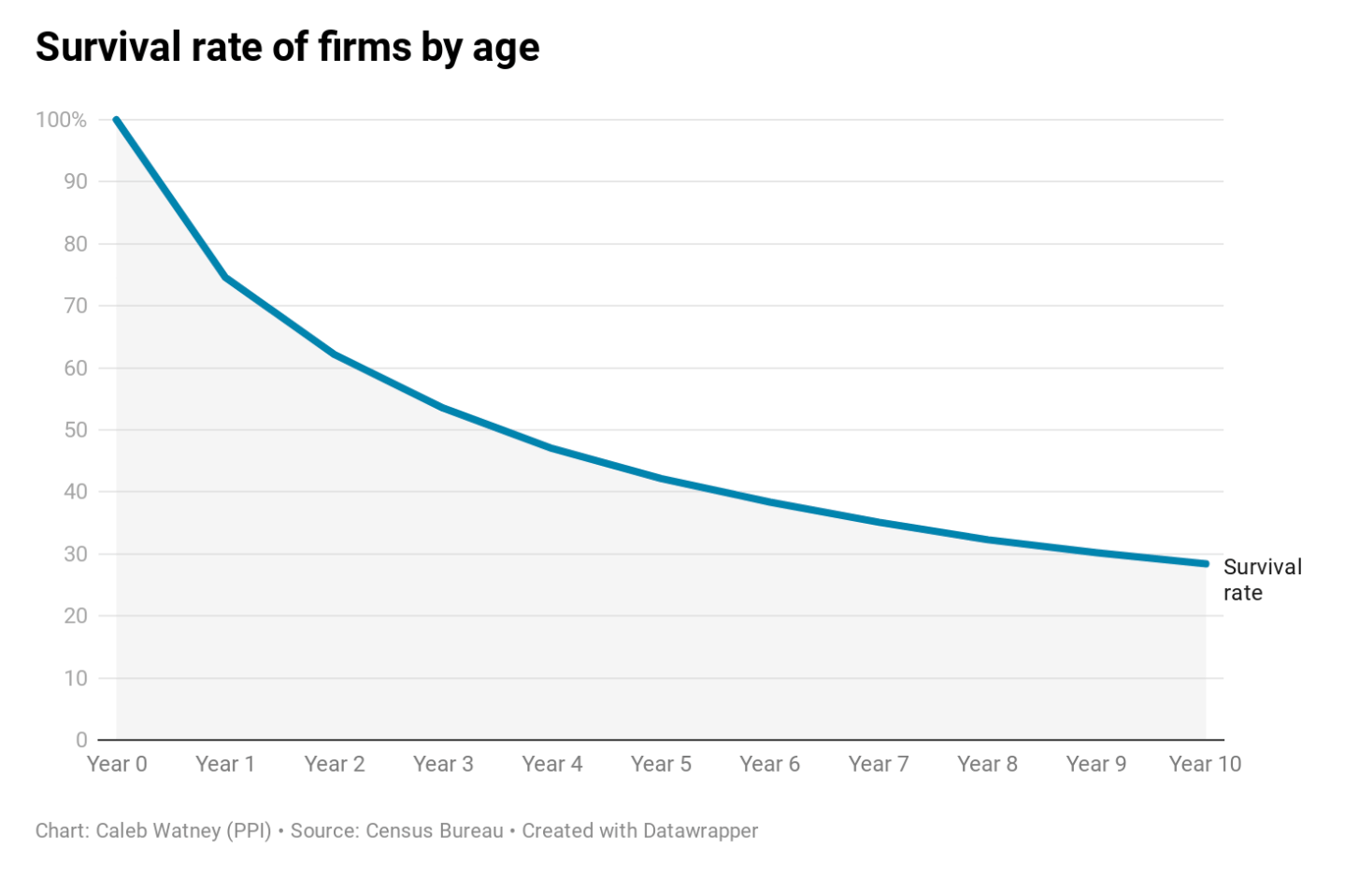 To begin with, we use the DHS estimate that the IER will attract 2,940 entrepreneurs per year with one founder for each firm. However, starting a business is difficult, and some percentage of firms will fail each year. Using the Business Employment Dynamics (BED) dataset from the U.S. Bureau of Labor Statistics, we can see the percentage of firms starting in 2010 that survived from year to year among the “Professional, scientific, and technical services,” category which we believe to be the closest analogue for the types of firms likely created under the IER.