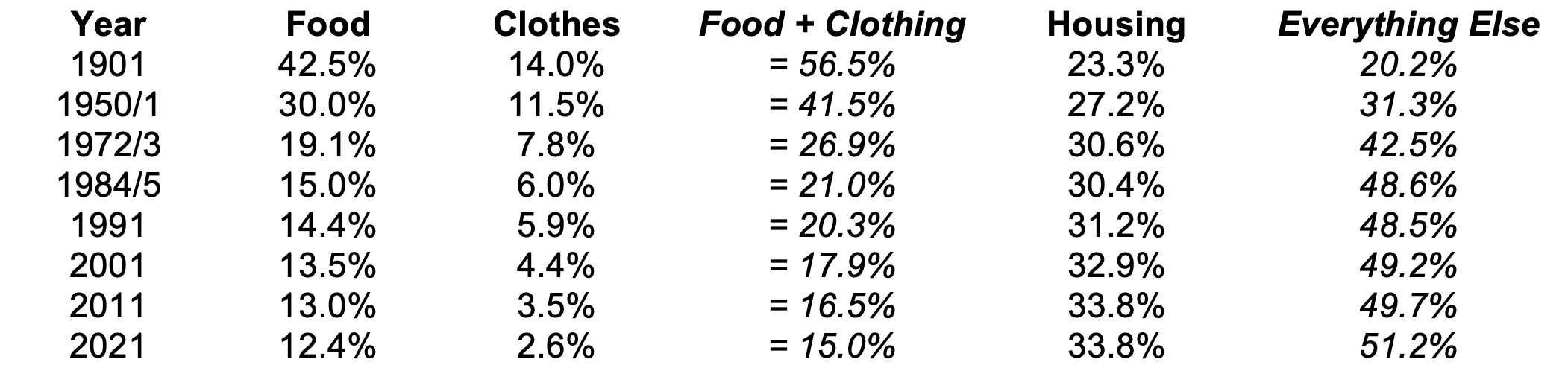 Food costs, a gigantic share of family budgets a century ago, fell by half from 1900 to 1970, and by another third since. Clothing costs have drifted steadily down with postwar trade opening and logistical innovation, halving from 1950 to 1980, and then halving again since. Spending on housing, meanwhile, has steadily risen* – 23.3% in 1901, 30.6% in 1972, 32.9% in 2001, 33.8% in 2021 — eating away some of the benefits of lower food and clothing costs. Only until quite recently, however, have the three big life necessities — food, shelter, and clothing — fallen below half of a typical family’s budget. A summary of budget shares for all households over 121 years: